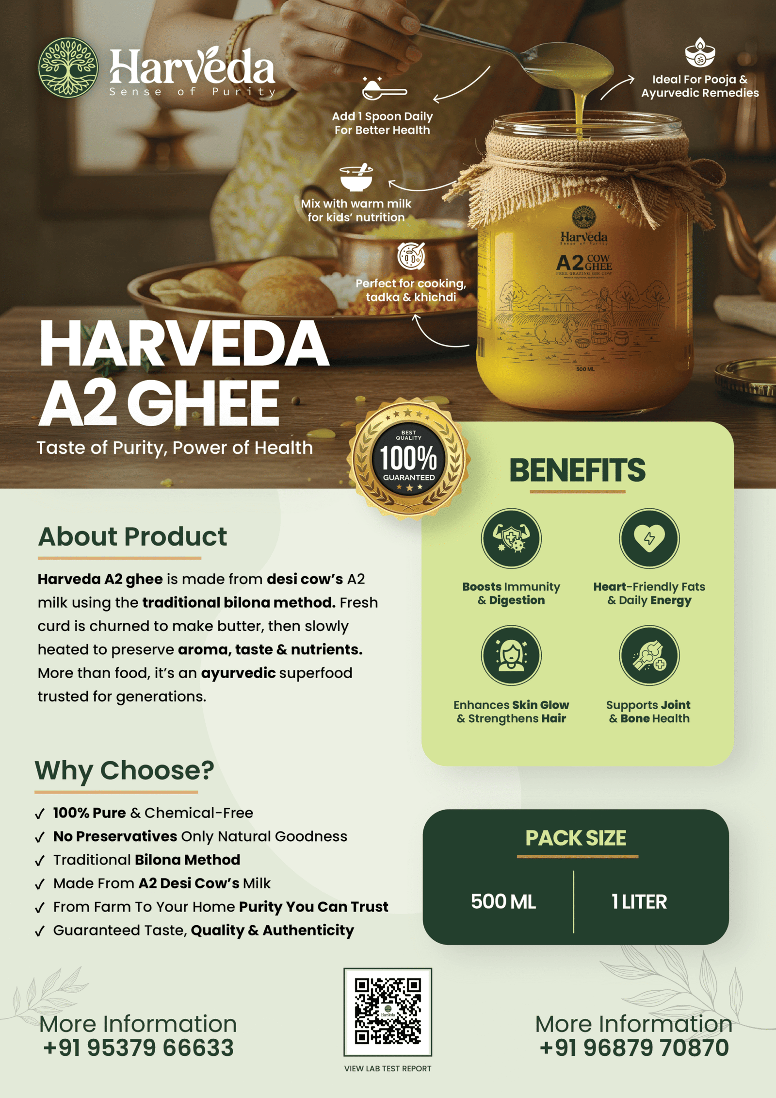 Crafted with care, our ghee retains maximum nutrients, making it perfect for daily cooking, Ayurveda, and puja rituals. Experience the richness of tradition in every spoon.